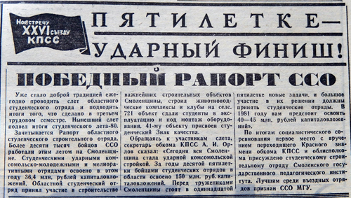 В 1976 году 12-тысячный областной отряд, сформированный высшими и средними специальными учебными заведения Смоленска, Смоленской области, Москвы, Украины, Белоруссии, Грузии, Азербайджана, Киргизии и Литвы, активно включился в выполнение планов капитального строительства X пятилетки на территории Смоленской области. Силами областного отряда в первом году пятилетки было освоено около 30 млн. рублей капвложений, в том числе 21 млн. рублей на сельском и мелиоративном строительстве. Линейные отряды безвозмездно отремонтировали 169 сельских школ, 85 клубов, оборудовано около 47 школьных кабинетов. Студенты создали 24 пионерских лагеря-спутника, 68 детских площадок, открыли пункты по ремонту бытовой техники.