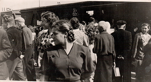 Смоляне провожают поезд целинников на работу. Смоленск, железнодорожный вокзал. 1956 год.